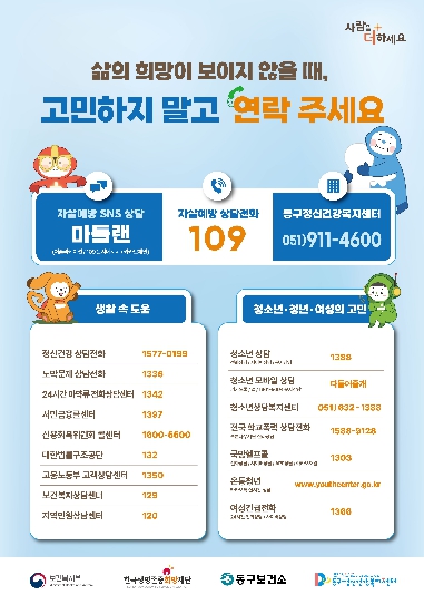 ![]() 부산 동구, 봄철 자살 고위험 시기(3~5월) 자살예방 집중 관리 |