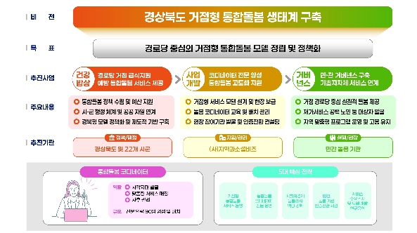 주요 사업으로 ①경로당 중심 어르신 밥상지원 ②통합돌봄 서비스 개발 ③돌봄코디네이터 양성․운영 ④경북형 통합돌봄 거버넌스 구축으로 의료·돌봄·주거관리, 안전, 이동관리 등 어르신 삶 전반을 아우르는 통합돌봄 패키지를 지원한다.