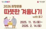 [시사토픽뉴스]서울 중구가 지난해 11월 15일부터 사회복지공동모금회와 함께 진행 중인‘2026 희망온돌 따뜻한 겨울나기’사업에 지난 1월 13일 기준, 구의 목표 모금액의 약 69%인 12억1천여만원의 성금·품이 모였다고 밝혔다. 구는 설 명절을 앞두고 있는 만큼 목표액을 달성할 수 있을 것으로 내다보고 있다. 이번에도 모금이 시작되자마자 지역사회 곳곳에서 온정 이어졌다. 개인 후원자 조양 씨가 6천만원, ㈜투데이아트 대표 박장선 씨가 4천만원을, 메리츠화재해상보험(주)와 새마을금고 명동지점에서 취약 주민을 위해 각각 5천만원...