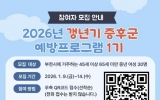 군산시 최준규 기자2026. 01.09[시사토픽뉴스]부천시는 부천시보건소에서 중년 여성의 건강한 삶을 지원하기 위해 1월 9일부터 14일까지 갱년기증후군 예방프로그램 ‘다시 건강한 나’ 제1기 참여자를 모집한다고 8일 밝혔다. 프로그램은 갱년기증후군을 예방하고 관리할 수 있도록 체계적인 교육과 실습을 제공하며, 중년 여성의 신체적·정신적 건강을 높이기 위해 2022년부터 운영하고 있다. 제1기 프로그램은 부천시에 거주하는 45세 이상 65세 미만 중년 여성을 대상으로 2월 4일부터 4월 29일까지 매주 수요일과 금요일 오전 10시 30분부터 11시 30분까지 총 1...