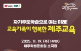 교육 최준규 기자2025. 11.17[시사토픽뉴스]제주특별자치도교육청은 19일 오후 2시 제주학생문화원 소극장에서 보호자를 대상으로 ‘자기주도학습으로 여는 미래’를 주제로 찾아가는 교육정책 서비스를 개최한다. 이번 행사는 제주 지역은 물론 전국의 학부모 누구나 현장 참석이나 행사 당일 한국교육방송(EBS) 고교강의(EBSi) 유튜브 생중계를 통해 참여할 수 있으며 정책 이음과 전문가 특강, 질의응답 토크 콘서트 순으로 진행된다. 특히 정책 이음에서는 교육부와 제주특별자치도교육청이 사교육 경감 대책 관련 정책을 설명하고 전문가 특강에서는 서울대학교 신종호 교수가...