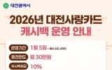 경제 최준규 기자2026. 01.02[시사토픽뉴스]대전시는 1월 5일부터 지역화폐 ‘대전사랑카드’ 운영을 시작한다. 시는 올해 총 5,000억 원 규모 발행을 목표로, 월 30만 원 구매 한도 내 10% 캐시백을 제공해 시민들이 일상생활에서 실질적인 소비 혜택을 체감할 수 있도록 할 계획이다. 특히 중단 없는 운영과 안정적인 제도 정착에 중점을 두고 지역경제 활성화를 도모한다는 방침이다. 앞서 대전시는 2025년 421억 원의 예산을 투입해 7월부터 대전사랑카드를 운영했으며, 월 50만 원 구매 한도, 최대 13% 캐시백을 제공한 바 있다. 이를 통해 약 ...