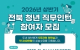 전라북도 최준규 기자2025. 11.12[시사토픽뉴스]전북특별자치도와 전북창조경제혁신센터가 ‘2026년 상반기 전북 청년 직무인턴’ 참여자를 11월 26일까지 모집한다. ‘전북 청년 직무인턴’은 도내 공공기관과 기업에서의 실무형 직무 체험을 통해 청년들의 취업 준비와 진로 탐색을 지원하는 전북 대표 청년 일자리 프로그램이다. 2017년부터 운영해오며 현장 경험 중심의 역량 강화 모델로 자리 잡았다. 올해에는 상하반기 총 433명이 참여했으며, 내년 상반기에는 전북은행, 전북국제협력진흥원, 전북신용보증재단 등 42개 기관·기업에서 215명의 청년이 참여할 예정이다. ...