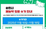 화순 최준규 기자2025. 11.06[시사토픽뉴스]순천시는 농가와 가정에서 사용 후 남은 폐농약과 유효기간이 지난 농약을 안전하게 수거하기 위해 폐농약 집중수거 기간을 운영한다고 밝혔다. 집중수거 기간은 오는 10일부터 19일까지이며, 수거는 읍・면 행정복지센터와 순천시 업사이클센터 더새롬에서 수거가 진행된다. 농민과 시민은 가까운 수거장소를 이용해 폐농약을 안전하게 배출할 수 있다. 이번 사업은 농가에 방치되기 쉬운 폐농약을 체계적으로 수거・처리해 환경오염을 예방하고 시민 안전을 강화하는 데 목적이 있다. 수거된 폐농약은 폐기물 전문처리업체를 통해 안전하게 ...