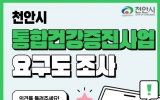 장수군 최준규 기자2025. 11.06[시사토픽뉴스] 천안시는 오는 28일까지 내년 지역사회 통합건강증진사업 추진을 위한 주민요구도 조사를 실시한다고 6일 밝혔다. 시는 내년 지역사회 통합건강증진사업 계획 수립 시 사업의 우선순위와 핵심성과 지표 선정 등 시민의 의견을 반영하기 위해 주민요구도 조사를 실시한다. 조사는 인적사항을 비롯해 건강증진사업에 대한 인식도·참여도·만족도·사업의 우선순위 등 총 12문항으로 구성돼 있으며, 정보무늬(QR코드)를 통해 비대면으로 참여하면 된다. 기타 문의사항은 천안시 동남구보건소 건강생활팀으로 문의하면 된다. ...