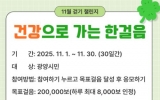 광양 최준규 기자2025. 10.21[시사토픽뉴스]광양시는 지역 주민의 건강생활 실천을 돕기 위해 11월 1일부터 30일까지 모바일 걷기 앱 '워크온'에서 ‘건강으로 가는 한걸음 11월 걷기 챌린지’를 운영한다고 밝혔다. 이번 걷기 챌린지는 1걸음당 1마일리지가 적립되며, 1일 최대 8천 마일리지가 누적된다. 기간 중 20만 보를 달성하면 20만 마일리지가 쌓여 모바일상품권(5천 원권) 응모가 가능하다. 시는 목표 걸음을 달성한 참여자 중 추첨을 통해 800명에게 상품권을 지급할 예정이다. 참여를 희망하는 시민은 모바일 걷기 앱 ‘워크온’을 설치하고 ‘광양...