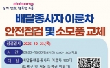 사회 최준규 기자2025. 10.21[시사토픽뉴스]서울 도봉구가 10월 23일 녹천역 건설자재창고(도봉구 덕릉로66길 84-1)에서 배달플랫폼 종사자를 대상으로 ‘이륜차 무상 안전점검 및 소모품 교체’ 행사를 개최한다. 이번 행사는 다가오는 겨울철 전 미리 이륜차 성능을 점검하고 결빙·한파로 인한 사고를 예방하기 위해 마련됐다. 앞서 지난 6월에는 도봉동 성균관대 야구장 부지에서 장마철 전 빗길 사고 등을 예방하기 위해 한차례 같은 행사를 진행했다. 23일 행사에는 쿠팡이츠서비스와 한국오토바이정비협회가 참여한다. 구에서는 장소제공과 안전용품 지원 등을, 쿠팡에서...
