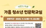 교육 최준규 기자2025. 10.20[시사토픽뉴스]부산광역시립시민도서관은 오는 11월 9일부터 23일까지 시민도서관에서 부산 지역 중학생과 학교 밖 청소년 30명을 대상으로 ‘가을 청소년 인문학 교실’을 운영한다. 이번 프로그램은 청소년들이 철학과 문학을 통해 스스로의 삶을 돌아보고, 깊이 있는 사고력과 자기 성찰의 힘을 기르도록 돕기 위해 마련됐다. 프로그램은 일상의 고민에서 철학적 질문을 찾고 생각을 확장해보는 ▲고민이 철학이 되는 시간과 헤르만 헤세의 ‘수레바퀴 아래서’를 읽고 함께 토론하며 사고해보는 ▲세계문학, 청소년을 만나다 총 2개 과정으로 구성했다....