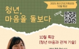 전주시 최준규 기자2025. 10.16[시사토픽뉴스]화성시정신건강복지센터가 오는 23일 오후 3시 유앤아이센터에서 2025 정신건강 기획강좌 10월 특강 ‘청년, 마음을 돌보다’를 개최한다. 이번 특강은 청년기의 마음 돌봄과 관계 속 심리적 어려움 관리를 주제로 진행되며, 박현순 아라차림 상담소 대표가 강연자로 나선다. 박현순 강사는 '마인드 제로','사춘기 살롱'의 저자이자 팟캐스트 ‘당신에게 보내는 따뜻한 목소리’의 진행자로, 청년·가족·직장인을 대상으로 한 심리상담 및 강의 경험이 풍부하다. 수강인원은 20명으로 선착순으로 접수하며, 참여 신청은 포스터의 큐...