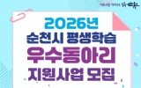 순천 최준규 기자2026. 02.05[시사토픽뉴스]순천시가 지역사회 평생학습 문화 확산을 위해 오는 9일부터 13일까지 ‘2026년 평생학습 우수동아리 지원사업’에 참여할 동아리를 모집한다고 밝혔다. 신청 대상은 공고일 기준 순천시 평생교육 포털에 등록된 학습 동아리로, 구성원이 7명 이상이고, 80% 이상 순천시민이어야 하며, 월 2회 이상 정기적인 활동을 해야 한다. 다만, 친목과 상호 교류 목적의 단순 소모임이나 영리를 목적으로 하거나 동일한 내용으로 다른 행정기관으로부터 보조를 받는 동아리 등은 신청 대상에서 제외된다. 신청 방법은 순천시 평생교육과에...