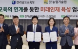 전라남도 최준규 기자2025. 10.14[시사토픽뉴스]전라남도교육청은 10월 14일 청사 5층 비지니스실에서 전라남도 농업기술원(원장 김행란)과 ‘농업과 교육의 연계를 통한 미래인재 육성 업무협약’을 체결했다. 이번 협약은 농업·농촌의 다양한 자원을 교육과 연계해 학생들이 체험 중심으로 배우고, 생태 감수성과 창의 역량을 키울 수 있도록 지원하기 위해 마련됐다. 이번 협약에 따라 양 기관은 ▲ 농촌교육농장과 치유 농장을 활용한 체험교육 확대 ▲ 늘봄학교 운영과 연계 가능한 프로그램 제공 ▲ 생태 기반 창의 교육, 진로, 창업 체험처 발굴 및 정보 제공 ▲ 지속가능한 ...