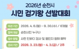 순천 최준규 기자2026. 03.23[시사토픽뉴스] 순천시는 시민들의 일상 속 걷기 실천을 유도하고 건강생활 습관 형성을 위해 ‘2026년 시민 걷기왕 선발대회’를 운영한다고 밝혔다. 이번 걷기왕 선발대회는 사전·사후 인바디 검사를 포함해 3월 23일부터 10월 28일까지 약 8개월간 진행되며, 스마트폰 걷기 앱 ‘워크온’ 순천시 커뮤니티 가입 시민을 대상으로 참여 신청을 받는다. 참여를 희망하는 시민은 오는 4월 3일까지 순천시보건소 2층 운동영양실을 방문해 사전 인바디 검사를 받은 후 워크온 가입을 확인하면 된다. 참가자(사전 인바디 검사자)는 4월 6일부...