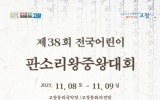 고창군 최준규 기자2025. 10.13[시사토픽뉴스]전북 고창군이 올해의 어린이 판소리 왕중왕을 가리는 ‘제38회 전국 어린이판소리왕중왕대회’ 참가자를 오는 11월7일까지 모집한다. 차세대 어린이 판소리 명창을 발굴 육성하고 판소리 여섯 바탕 사설을 집대성하신 동리 신재효 선생의 문화예술사적 업적을 기념하며 유업을 계승하기 위해 고창군과 KBS전주방송총국이 공동주최하고 (사)동리문화사업회가 주관한다. 대회는 고창 동리국악당에서 11월8일 예선을 거쳐 이튿날(9일) 축하 공연과 병행하여 예선을 통과한 7명의 어린이가 본선 경연을 한다. 왕중왕전은 KBS전주방송...