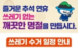 여수 최준규 기자2025. 09.26[시사토픽뉴스]여수시는 다가오는 추석 연휴 기간 시민과 귀성객이 불편 없이 명절을 보낼 수 있도록 생활폐기물 수거 일정을 조정해 운영한다. 연휴 중 생활폐기물 수거는 ▲10월 5일 오전 5시부터 9시까지 단축 수거를 실시하며 ▲추석 당일 6일과 다음 날 7일에는 수거를 하지 않는다. 이외 ▲10월 3일, 4일, 8일, 9일은 평상시와 같이 정상 수거한다. 수거가 중단되는 휴무일에는 생활폐기물 기동처리반이 주요 도로변 수거와 긴급 민원 처리를 진행할 예정이다. 또한 시는 지난 9월 22일부터 10월 1일까지 ‘명절맞이 새단장 청...