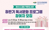 여수 최준규 기자2025. 09.22[시사토픽뉴스]여수시는 9월 22일부터 26일까지 공립 작은도서관 ‘2025년 하반기 독서문화 프로그램’ 수강생을 모집한다. 이번 프로그램은 유아부터 성인까지 다양한 연령층이 참여할 수 있도록 총 9개로 마련됐으며 오는 10월부터 11월까지 프로그램별 총 6회씩 운영된다. 운영 작은도서관은 ▲여문늘벗(구 중부보건지소) ▲꿈을키우는(미평 선경 3차 아파트) ▲화양열린(화양면민회관 2층) ▲청솔글누리(돌산 청솔 2차 아파트) 등 4곳이다. 성인 대상 프로그램은 ▲시니어, 그림책 속 색감의 조화를 이루다 ▲글이 머무는 수채화 ▲나를...