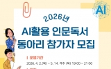 화순 최준규 기자2026. 03.19[시사토픽뉴스] 인천광역시교육청서구도서관은 4월 2일부터 5월 14일까지 관내 성인을 대상으로 ‘AI 활용 인문독서 동아리’ 프로그램을 운영한다. 이번 프로그램은 독서모임 전문가 원하나 작가가 진행을 맡아, ‘소설처럼’, ‘혼모노’, ‘왜의 쓸모’, ‘1984’를 함께 읽으며 AI 시대 독서의 의미를 모색한다. 특히 시민들이 디지털 기술을 독서 활동에 능동적으로 활용할 수 있도록 챗GPT로 책 내용을 요약하고 발제문을 작성하는 실습 중심으로 진행된다. 프로그램은 4월 2일부터 5월 14일 목요일(격주) 오후 7시부터 9시까지...