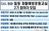 [시사토픽뉴스]거창군은 10월 2일부터 12월 30일까지 운영되는'다시, 청춘 힐링 재활예방운동교실 2기'참여자 8명을 오는 9월 22일부터 26일까지 5일간 모집한다. 해당 프로그램은 거동이 가능한 65세 이상 거창군민을 대상으로 근력 증진 및 일상생활 동작 훈련을 통해 장애를 예방하고 사회 참여를 확대하는 것을 목적으로 하며, 특히 참여 경험이 없는 신규대상자를 우선 선정해 더 많은 군민이 프로그램에 참여할 수 있도록 할 예정이다. 프로그램은 재활전담인력의 지도하에 보건소 물리치료실에 구비된 6종 기구를 활용해 소규모 맞춤형...