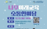 강진 최준규 기자2025. 12.03[시사토픽뉴스]전라남도 나주시가 미래 교육 성과를 시민과 공유하는 ‘나주미래교육소통한마당’을 오는 12월 13일 한국에너지공과대학교 대강당에서 개최한다. 이번 행사는 올해 추진한 교육 프로그램의 성과를 나누고 학생과 학부모가 함께 참여하는 소통 중심의 교육 축제로 꾸며질 예정이다. 나주시와 나주교육진흥재단이 공동 주최하고 나주미래교육지원센터가 주관하는 이번 행사는 오후 2시 식전 공연인 나주이화유스오케스트라 연주를 시작으로 본격 진행된다. 행사에서는 나주교육진흥재단과 나주미래교육지원센터가 추진해 온 주요 사업의 경과보고, 교육...