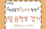 전주시 최준규 기자2026. 01.26[시사토픽뉴스]거창군은 오는 2월 1일부터 3월 17일까지 거창군민을 대상으로 신체활동 증진과 생활 속 걷기 실천 활성화를 위해 '거창韓걸음'1차 챌린지를 운영한다. 이번 챌린지는 총 45일간 진행되며, 하루 8천보씩 총 36만보 걷기에 도전하여 목표 달성한 사람에게 소정의 상품을 지급한다. 거창군민 중 스마트폰 소지자는 누구나 참여 가능하며 플레이스토어 또는 앱 스토어에서 ‘워크온(Walk ON)’을 검색해 설치한 후 '거창韓걸음'커뮤니티에 가입해 챌린지에 참여할 수 있다. 군은 걷기 실천을 지속해서 유도하고 건강 생활 습관...