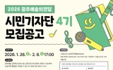 광주광역시 최준규 기자2026. 01.25[시사토픽뉴스]광주광역시 예술의전당은 전당의 다양한 공연 정보와 문화 소식을 직접 취재하고 공식 온라인 채널을 통해 알릴 ‘2026 광주예술의전당 시민기자단 4기’를 26일부터 2월6일까지 모집한다. 시민기자단은 문화예술 공연에 관심이 많고, 홍보 게시글이나 영상 콘텐츠 등 멀티미디어 콘텐츠 제작이 가능한 성인이면 누구나 지원할 수 있다. 모집 분야는 글·사진과 영상 2개 분야이며, 총 15명을 선발한다. 선발된 시민기자단은 오는 3월부터 12월 말까지 약 10개월간 활동하며, 광주예술의전당의 공연과 문화예술 현장을 취재해 기사...