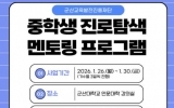 군산시 최준규 기자2025. 12.17[시사토픽뉴스]군산교육발전진흥재단이 겨울방학을 맞아 ‘중학생 진로탐색 멘토링 프로그램’ 참여자를 모집한다. 이번 프로그램은 중학생들에게 진로 탐색의 기회를 제공하고 자기주도적 학습 의욕을 높이기 위해 마련됐다. 진행은 2026년 1월 26일부터 30일까지 군산대학교 인문대학 강의실에서 진행되며, 총 130명의 중학생이 참여할 예정이다. 특히 효율적인 운영을 위해 2개 기수(1기 : 2026년 1월 26일 ~ 28일 / 2기 : 2026년 1월 28일~30일)로 나누어 진행한다. 주요 프로그램은 인공지능(AI) 기반 진로·학...