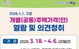 순천 최준규 기자2026. 03.18[시사토픽뉴스] 순천시는 1월 1일 기준 개별(공동)주택 가격 열람 및 의견제출 기간을 3월 18일부터 4월 6일까지 운영한다고 밝혔다. 이번 열람 대상 개별주택은 32,223호, 공동주택은 90,057호로 개별(공동)주택 특성 등을 조사해 산정했으며, 가격의 공정성과 객관성을 높이기 위해 한국부동산원(순천지사)의 산정가격 적정성 여부 등의 검증 절차를 마쳤다. 개별(공동)주택 가격의 열람은 세정과 및 읍면동 행정복지센터를 방문하거나 순천시 누리집 및 부동산공시가격알리미를 통해 확인할 수 있다. 열람가격에 의견이 있는 소유자 ...