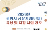 사회 최준규 기자2026. 03.17[시사토픽뉴스]광명시는 ‘2026년 광명시 공유기업(단체) 육성과 지정 사업’ 공모를 오는 27일까지 접수한다. 이번 공모는 물건, 공간, 재능 등 자원을 공유해 지역사회의 경제적, 사회적 문제를 해결하고자 하는 사업체를 육성하고 지정하기 위해 마련했다. 신청 대상은 ▲공유기업 육성 분야 ▲공유기업(단체) 지정 사업 등 두 가지 분야로 나뉜다. 공유기업 육성 분야는 광명시에 주소를 둔 예비창업자 또는 공고일(3월 9일) 기준 본점을 광명시에 둔 사업 기간 7년 미만의 기업과 단체가 대상이다. 공유기업(단체) 지정 사업은 관련 ...
