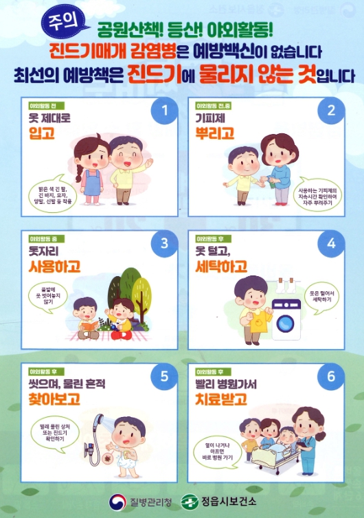 | 정읍시 ‘가을철 숨은 위협, 털진드기 활동 급증 야외 활동 시’ 주의 당부 긴옷. 긴팔 착용. 진드기 기피제 사용 등 예방 수칙 준수 최준규 기자 [email protected] |