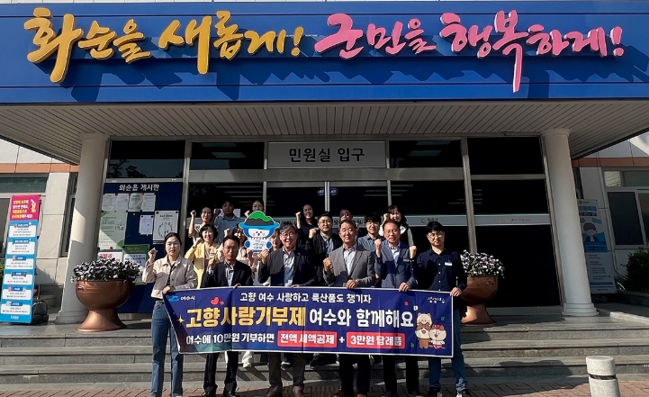 ![]() 여수시 농산물유통과 직원과 화순군 화순읍 직원들이 고향사랑기부제 상호기부에 동참하고 화순읍 행정복지센터 입구에서 함께 기념사진을 촬영했다. |