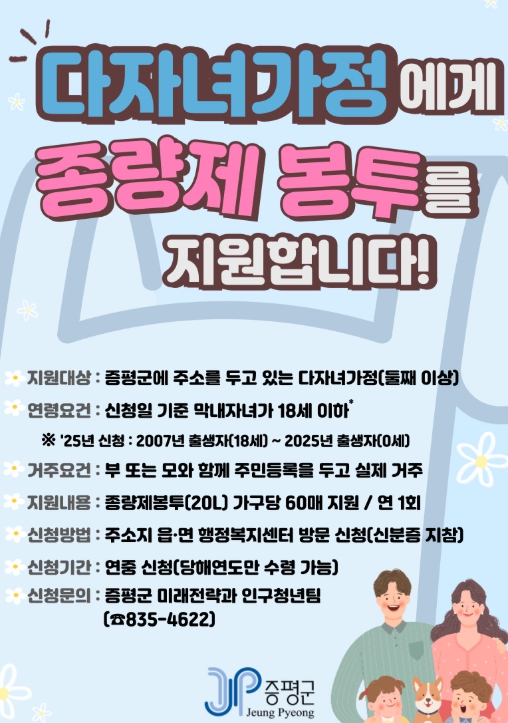 ![]() 다자녀가정에 종량제봉투 60매 지원 |