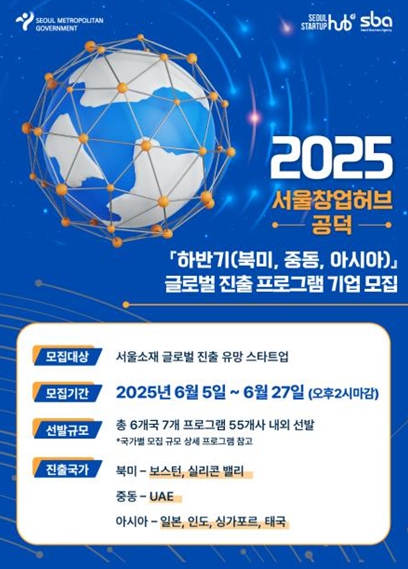 서울시 대표 창업지원시설인 서울창업허브 공덕은 오는 6월 27일(금)까지 ‘2025년 하반기 글로벌 진출 지원 프로그램’ 참가 기업 55개사를 모집한다고 밝혔다.