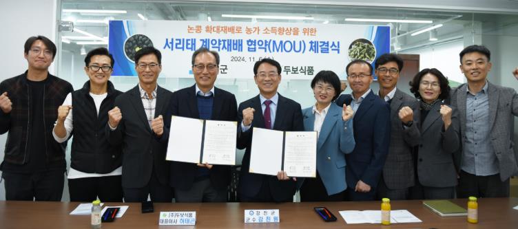 쌀 생산량 조정 정책으로 추진되는 논콩 재배의 경쟁력 있는 추진을 위해 강진원 군수의 의견 제시로 작년부터 시작한 서리태 계약재배는 올해 150ha의 규모로 국내 굴지의 양곡유통회사인 ㈜두보식품과 업무협약을 맺었고, 최근에는 경기도 제과업체와 약 30ha의 규모로 계약했다.