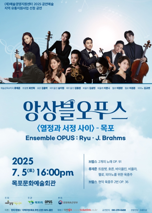 이번 공연은 시민들의 문화예술 향유 기회 확대를 위해 문화체육관광부와 예술경영지원센터가 추진하는 ‘2025년 공연예술지역 유통지원사업’ 선정작으로, 2009년 창단된 실내악의 명가 ‘앙상블오푸스’가 감동적인 무대를 선사할 예정이다.