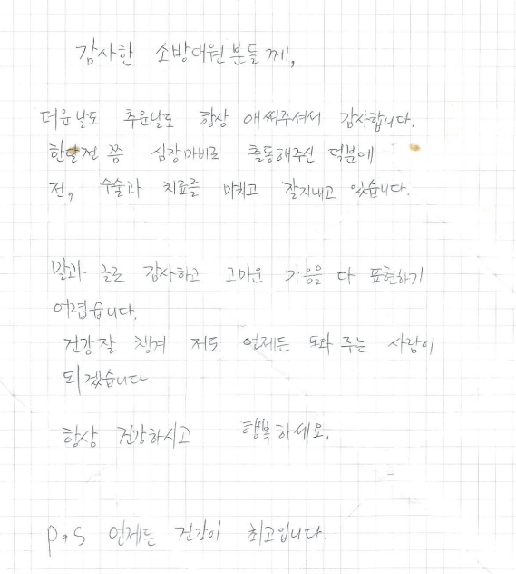 ![]() 신속한 응급처치로 생명 구한 천안서북소방서 구급대, 환자로부터 감사 편지 받아 |