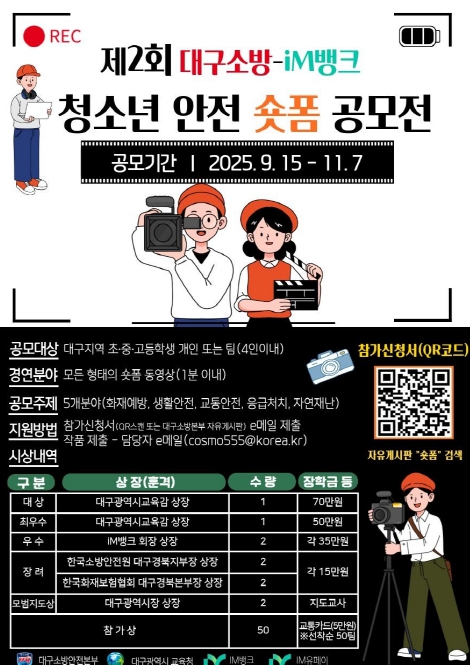 우수작품은 대구소방안전본부, 대구시교육청, iM뱅크 공식 SNS를 통해 시민들에게 공개되고, 안전문화 홍보 영상으로도 활용될 예정이다.
