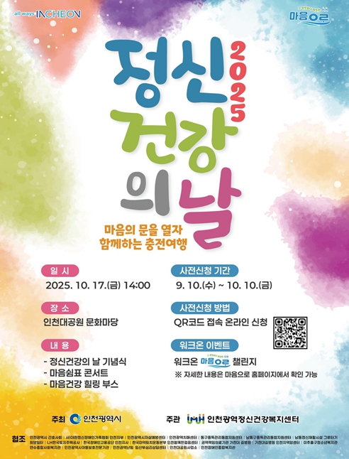 이에 따라 인천시는 ‘혼자가 아닌 함께, 일상 속에서 마음건강을 회복한다’는 의미를 담아 시민 모두가 참여하고 공감할 수 있는 축제로 이번 기념행사를 마련했다.