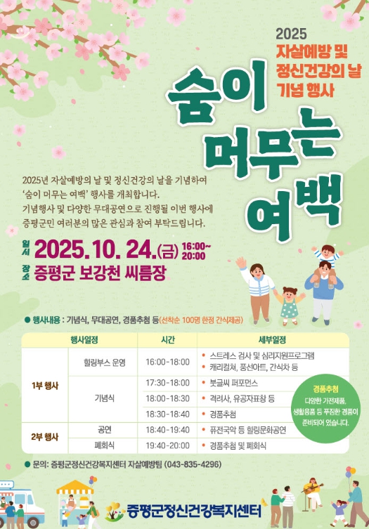 ![]() 증평군, 이달 24일 자살예방·정신건강의 날 행사 |