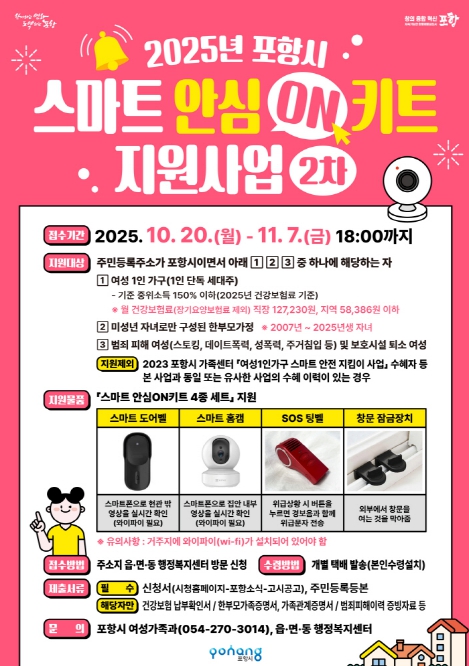 지원 대상은 신청일 기준 포항시에 주소를 둔 여성 1인가구, 한부모가정, 범죄피해 여성(스토킹·성폭력·주거침입 등), 보호시설 퇴소 여성 등이다.