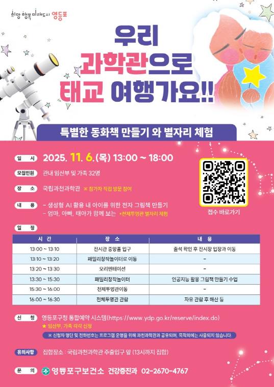 참여 대상은 임산부 및 가족 32명이다. 영등포구청 누리집 ‘통합예약’ 시스템을 통해 11월 4일까지 신청할 수 있으며 참가비는 무료다.