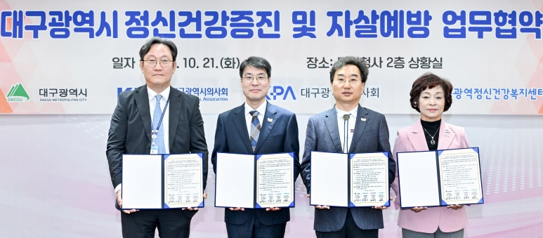이번 협약을 통해 각 단체는 전문성과 자원을 적극 활용해 ‘대구시민 정신·자살 고위험군 발굴과 정신건강 서비스 연계’와 ‘생명지킴이 홍보 및 활동 참여’ 등에 힘을 모을 계획이다.