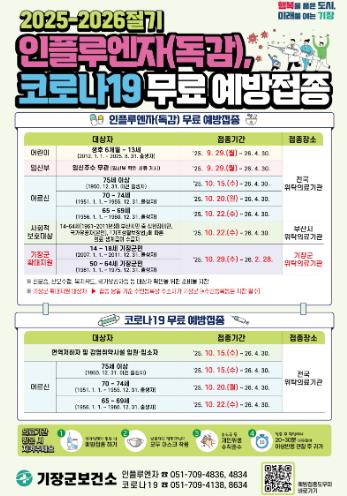 확대 지원 대상자는 오는 2026년 2월 28일까지 기장군 내 위탁의료기관 64개소에서 무료 접종이 가능하다.