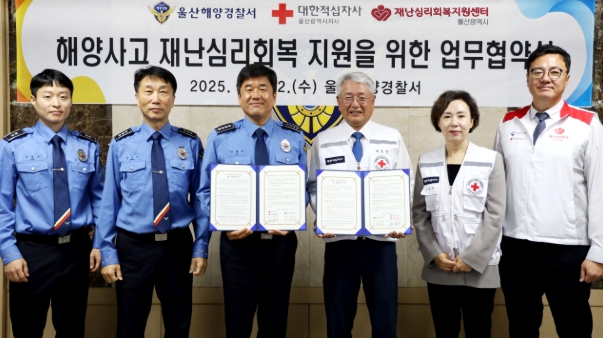 울산해양경찰은 22일 대한적십자사 울산지사와 함께 해양사고 피해자, 해양경찰 대상 재난심리회복지원 강화를 위한 업무협약을 체결했다.