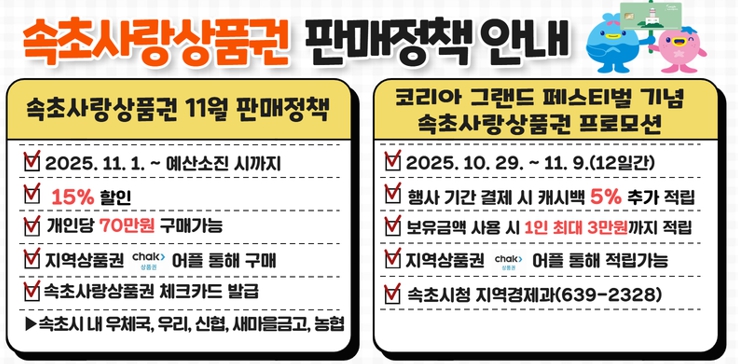 ![]() 속초사랑상품권 11월 15% 할인, 캐시백 5% 추가 적립 |