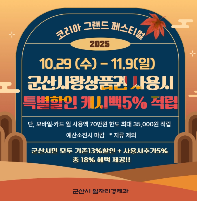 행사 기간 내에 군산시는 모바일 및 카드형 군산사랑상품권을 사용하는 소비자에게 기존 할인율 13%에 더해 추가로 5% 캐시백으로 적립해주는 특별 행사를 진행한다.