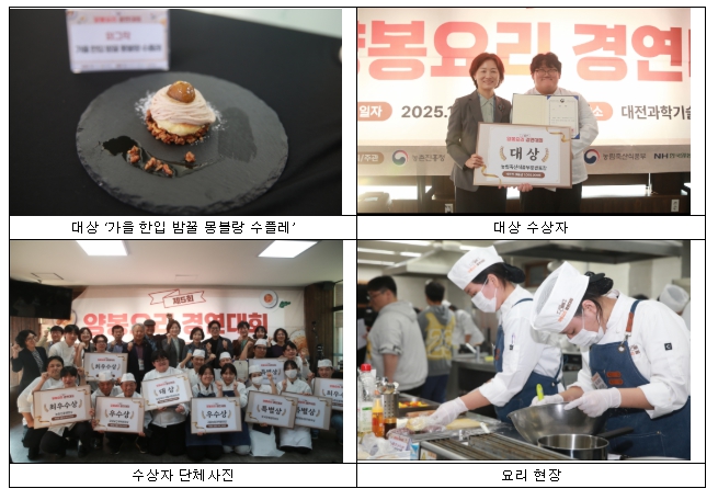 대상(농림축산식품부장관)에는 양봉산물 밤꿀을 이용해 ‘가을 한입 밤꿀 몽블랑 수플레’를 만든 ‘김결이’ 참가자가 선정됐다. 묵직한 풍미와 단맛을 내는 밤꿀과 잼을 이용해 만든 크림을 수플레 위에 올린 후식(디저트)이다. 심사위원들은 주제에 맞게 간편하면서도 맛과 영양이 조화를 이룬다며 높이 평가했다.