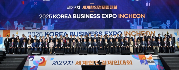 ![]() 유정복 인천광역시장이 27일 송도컨벤시아에서 열린 '제29차 세계한인경제인대회 개회식'에서 참석자들과 기념촬영을 하고 있다. |