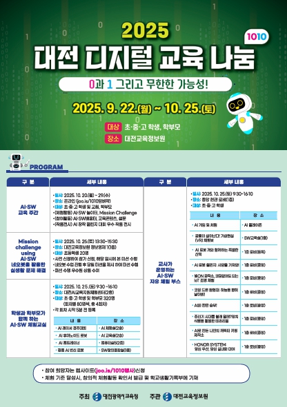 대전교육정보원 이영주 원장은“‘2025년 대전 디지털 교육 나눔1010’을 통해 학생·학부모·교원 교육공동체 모두 빠르게 변화하는 AI·SW 기술을 직접 경험하며 이해하는 기회를 제공했고, 앞으로도 AI교육 활성화 및 문화 조성을 위한 다양한 프로그램을 운영하겠다”라고 말했다.