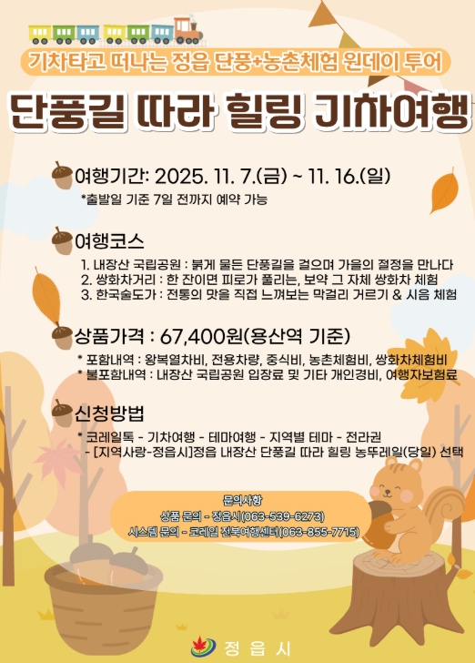 ![]() ‘내장산 단풍 + 농촌체험’ 농뚜레일 기차여행 |