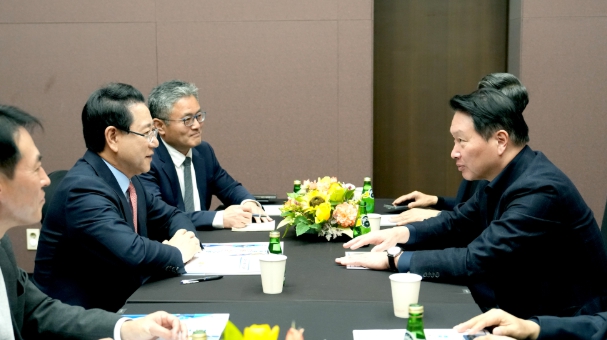 ![]() 김영록 전라남도지사가 3일 서울 코엑스 오픈미팅룸에서 최태원 SK그룹 회장과 면담을 갖고 ‘오픈AI AI데이터센터’ 등과 관련해 투자협의를 하고 있다. |