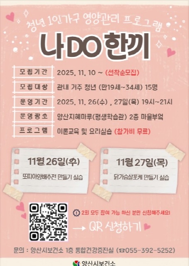 모집 대상자는 양산시에 거주하는 만 19세에서 34세 사이의 1인 가구 청년 15명이며, 양산지혜마루(평생학습관) 2층 마을부엌에서 이론교육과 요리실습을 병행하는 대면 교육으로 진행된다. 참가 신청은 11월 10일부터 안내문의 큐알(QR)코드를 통해 가능하며, 선착순으로 접수된다.